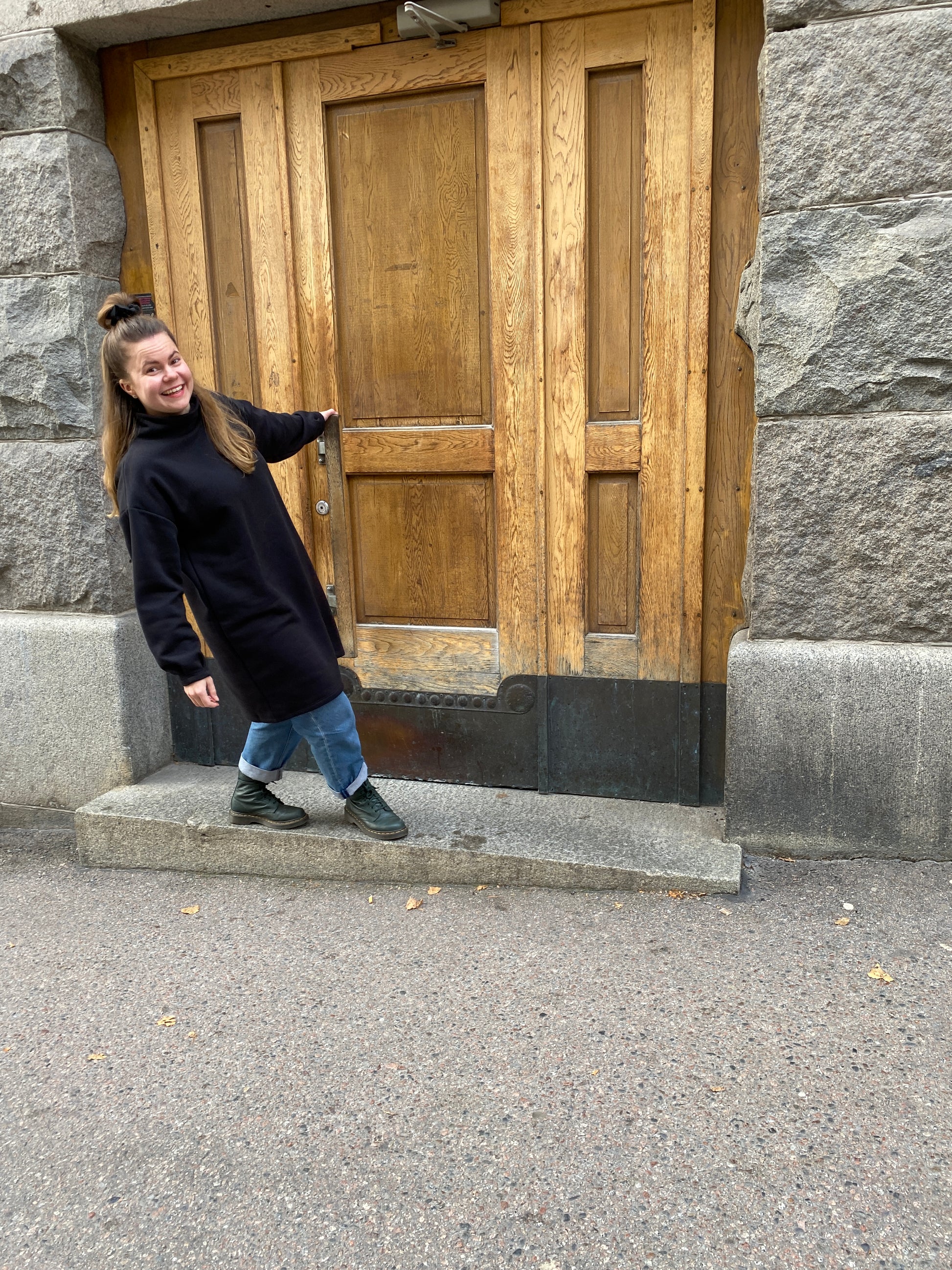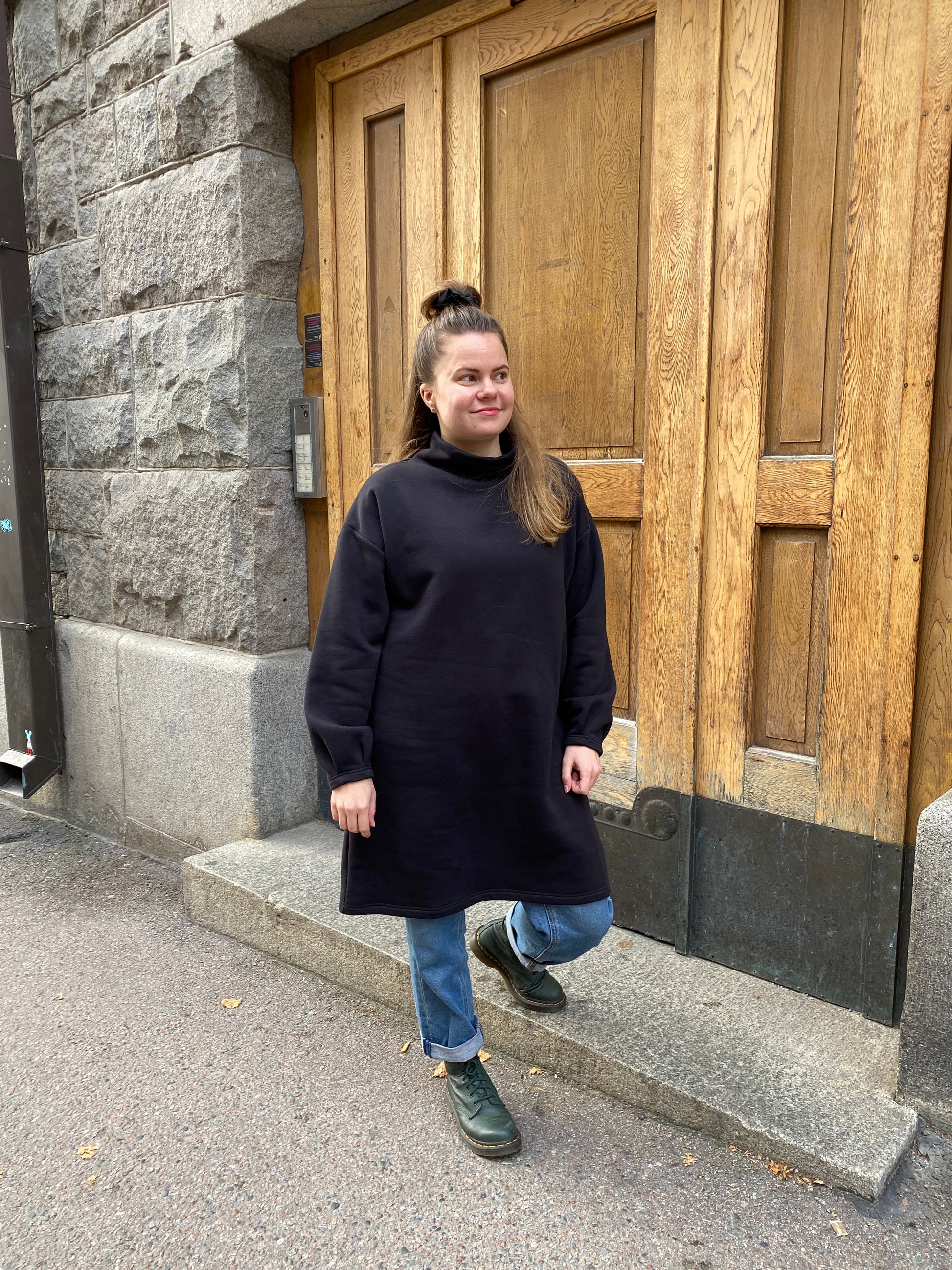 Musta boxy-mallinen collegemekko, kilpikonnakaulus.